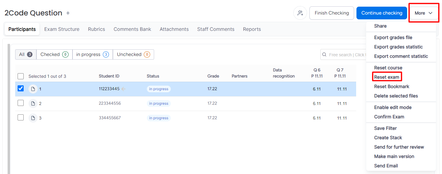 3. In the "More" menu, select "Reset exam" - be careful not to select "Reset course" an action that will reset all the notebooks in the course.