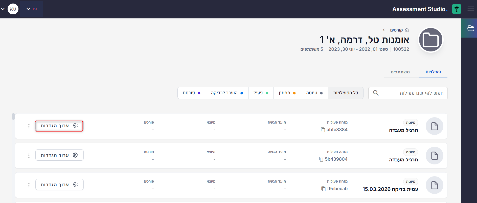 - בדף האירועים (קורסים), סננו את האירועים לפי סטטוס "פעיל" כדי לאתר את המבחן הנוכחי.
